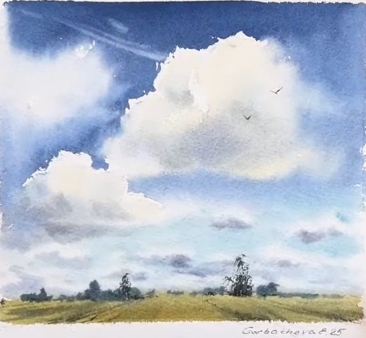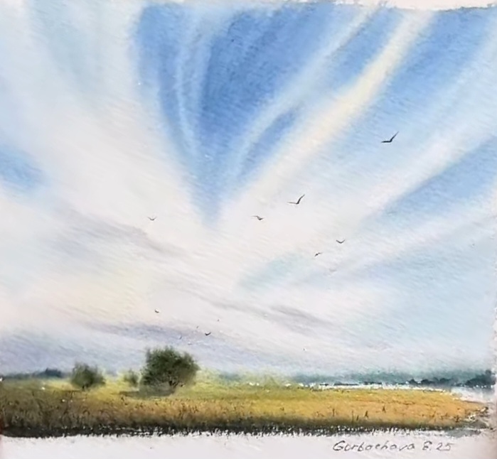 Алёна, спасибо. Да, на первой картинке бумага была очень влажная и цвета сразу расплывались , несколько раз пыталась исправить.