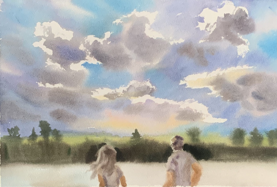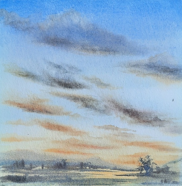 Вот и с облаками, хотела их как-то композиционно красиво расположить, но при работе с красками стали получаться они такие однотипные и одного размера.