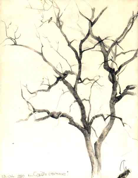 Claira, симпатичное дерево. По пересечениям - можно отдельно попробовать попересекать ветки - рисовать не целое дерево, а кусочек, и поглядеть, что получается. Можно больше внимание уделять контрформам (дыркам между ветвями), смотреть, чтобы они сами по себе были красивые и разные. Можно не пытаться отследить все ветки - все равно же это сверхзадача, и кое-где рисовать их массами, хотя бы потому что подход "вот у меня толстая ветка, она разделилась на три ветки потоньше, а уж из них растет много совсем тоненьких веточек" сам по себе не плох, но ведет к уплощению дерева. В реальности ветки растут во всех направлениях, то что идет на зрителя и от зрителя уходит в ракурс, их особо и не проследишь. Можно воспользоваться простым, но эффектным приемом "что ближе, то темнее или контрастней", или выделять темным перегибы формы. Вообще, когда есть разница по тону на протяжении ствола или ветки - это хорошо)