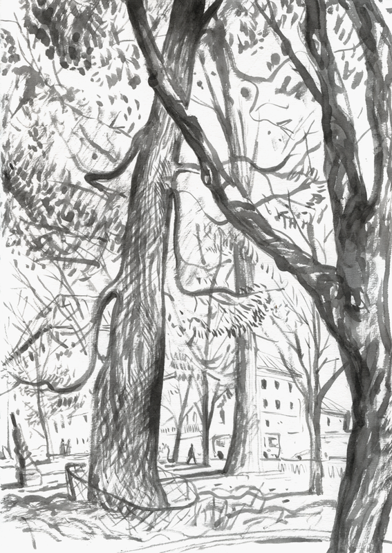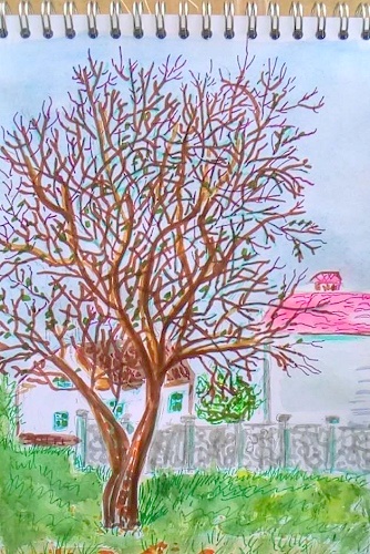 Пока грецкий орех стоит почти голый, нарисовала его "скелет". Пленэрить пока не получается, рисовала по своей фотографии. Акварель, гелевая ручка и маркеры, а5, быстрый рисунок. Не получилось нарисовать красиво пересечение веток. Есть ли какие-то приёмы и способы? Пока не нашла. Следующий у меня дуб, хотелось бы нарисовать лучше. . .