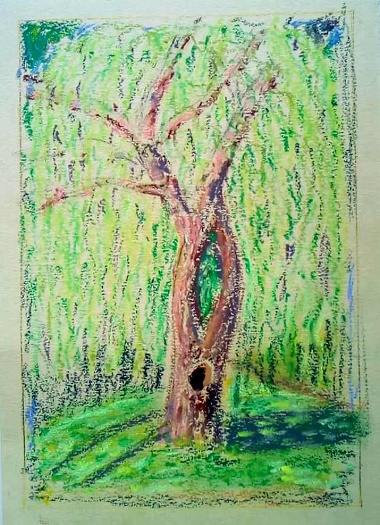 Рисунок масляной пастелью по своей фотографии, А5. Нашлась в укромно месте старая ива с дыркой в стволе. Каждое дерево на своём пути теперь рассматриваю, интересные снимаю и собираю как Плюшкин)) .