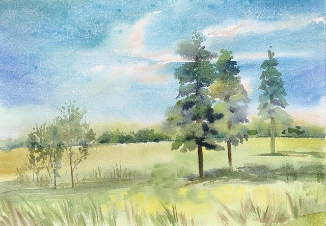 | после темы с летним пейзажем в Акварельных тренировках написала по своему снимку (это где-то в районе Бологого)) , но поле и пара елок может быть в любом месте