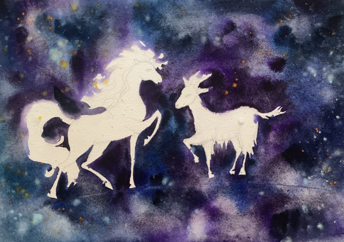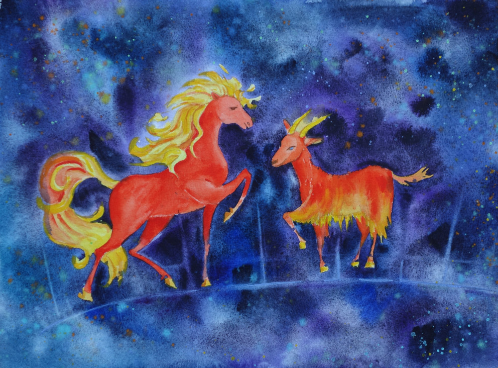 | lu-chia, очень красиво! Отличная работа! Звёздное небо такое красивое и лошадь и коза грациозные!