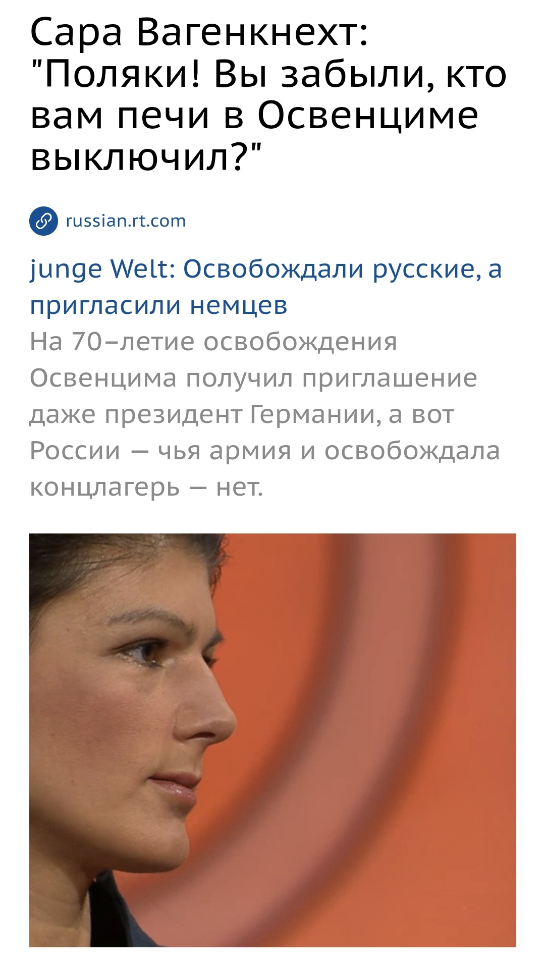 Сара Вагенкнехт, будучи представителем Левой партии в бундестаге Германии, и вовсе не сдерживалась в эмоциях: "Поляки! Вы забыли, кто вам печи в Освенциме выключил? Или вы, вписываясь за украинских нацистов, ищете того, кто бы вам напомнил, как они действуют?"