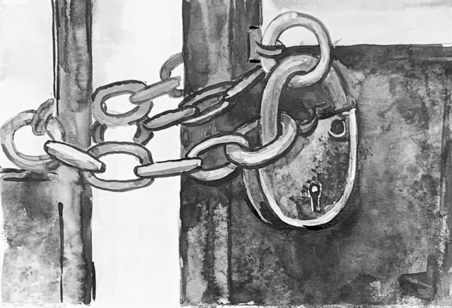| lu-chia, на двери и замке ржавчина хорошо видна  Непростое задание. В сети не нашла рисунков ржавчины в ч/б , хотелось подсмотреть и перенять опыт. Угольный карандаш и мел. .