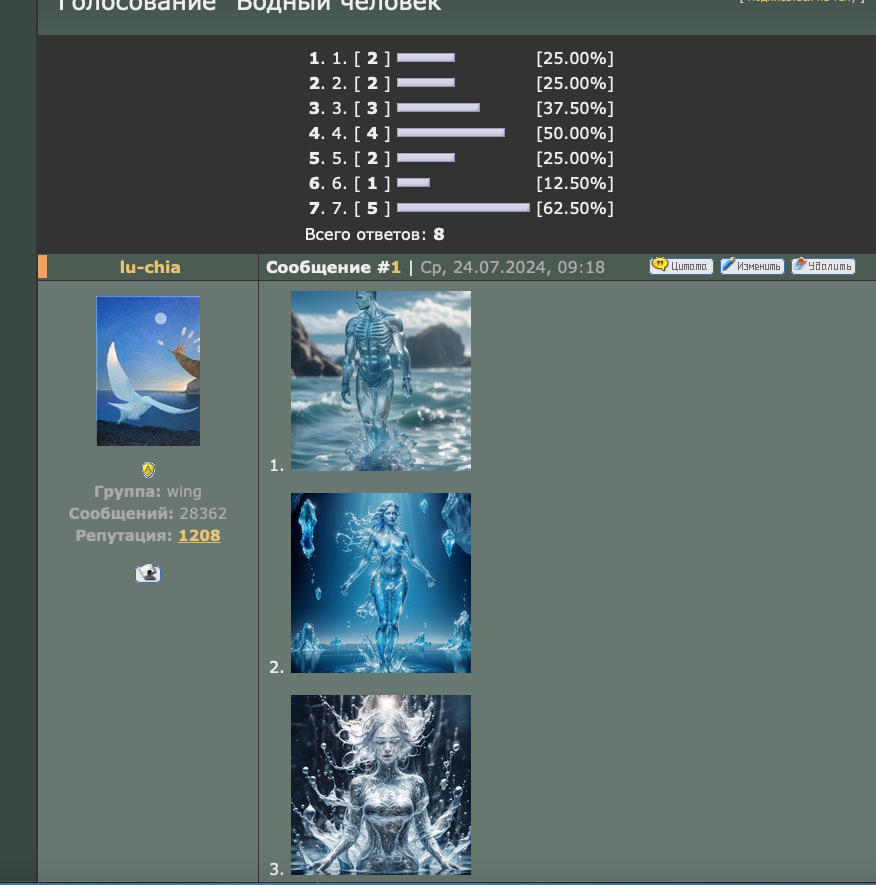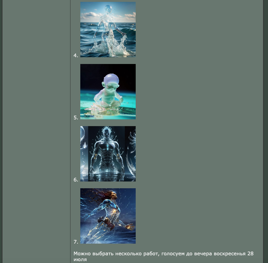 | naVigateur1576, шикарный в 30-ом сообщении!!! Очень здорово, что он «из воды» и под водой... У меня возникла ассоциация с пришельцем из фильма «Хищник», который в полупрозрачном виде по лесу шастал и пугал доблестных американских спецназовцев. Я не решилась такое сочинять — непростая задача. А тут такие красивый водянистые граждане и гражданки у всех