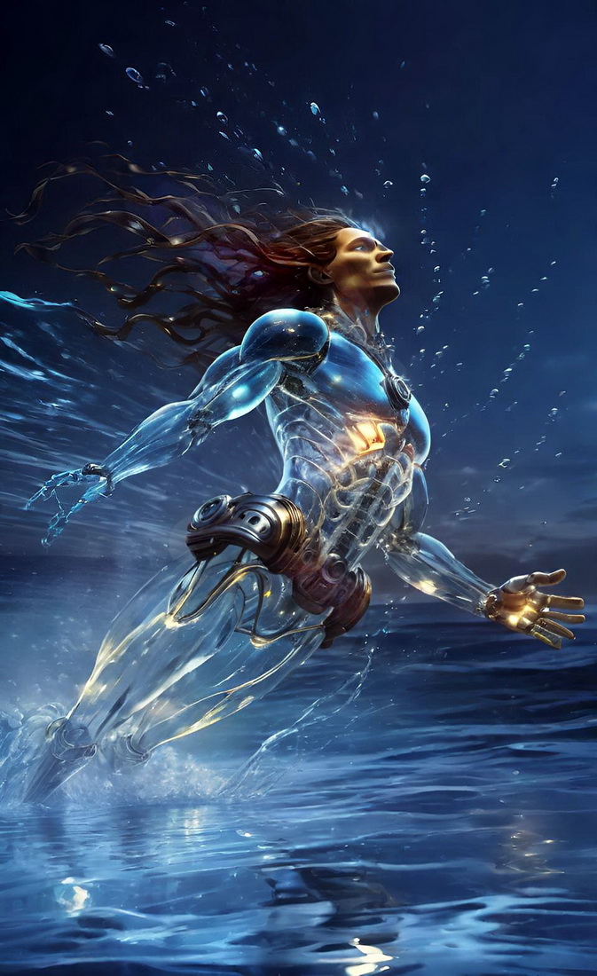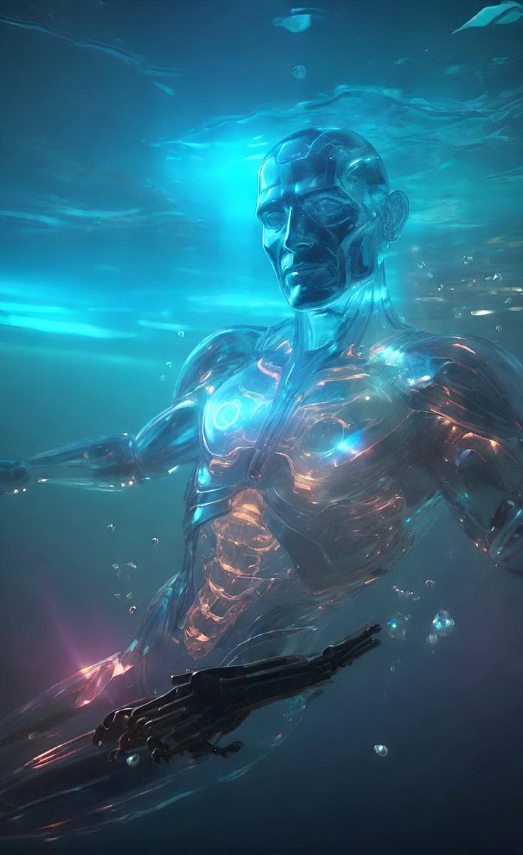 | Вообще ИИ подбросил интересную вариант будущего аква-скафандра для "водного человека" - почти ихтиандра. Тонкая плёнка не только полностью облегает человека, но и создаёт жесткий панцирный кожух в грудной области. В области живота и в местах сочлений, высветленных красноватым свечением происходит ввод кислорода и его вывод, по аналогу с жабрами. Поясной ремень содержит всю систему жизнеобеспечения..