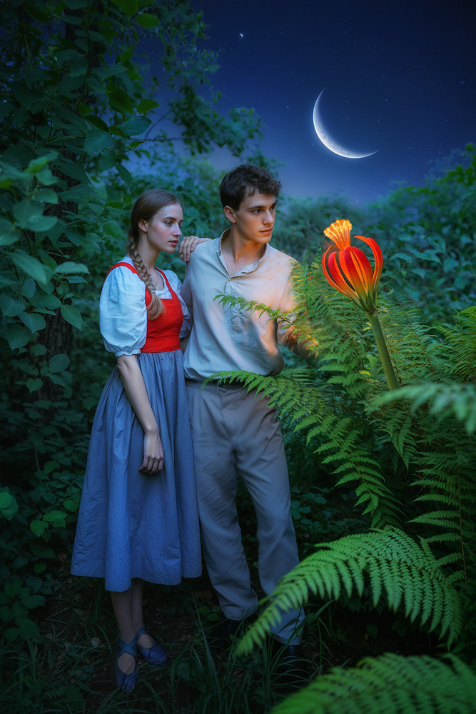 Не на полянах, а в лесу, В глубокой чаще он запрятан, Там ищут дивную красу Всю ночь девчонки и ребята.